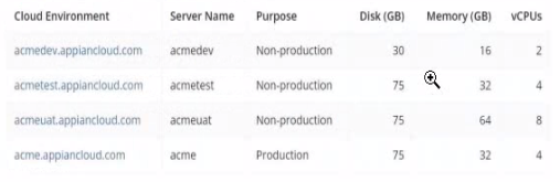 acmetest.appiancloud.com (acmetest): Non-production, Disk: 75 GB, Memory: 32 GB, vCPUs: 4