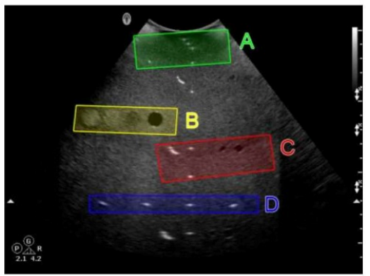 In a tissue-mimicking phantom, the group of targets aligned side-by-side (horizontally) is used to evaluate transverse (lateral) distance measurement accuracy. In the image, target group C (in red) represents the lateral spacing targets.