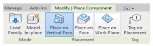 ''Wall-based components, such as surface-mounted panels, display the Place on Vertical Face option. This confirms the family is wall-hosted and cannot be placed freely on floors or reference planes.''