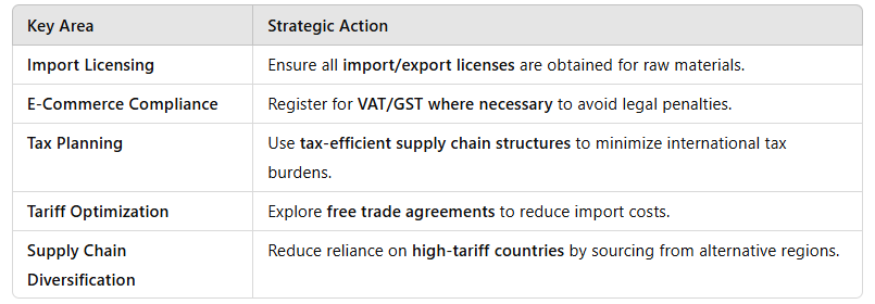 Manage import duties, VAT, and corporate tax obligations effectively.