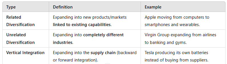 Example: Amazon expanded from an online bookstore to cloud computing (AWS) due to competition and limited retail growth.