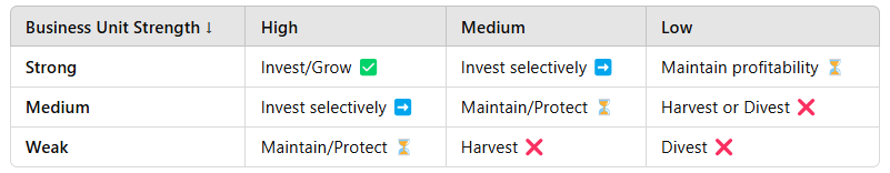 The GE McKinsey Matrix categorizes business units into nine strategic zones, guiding investment decisions: