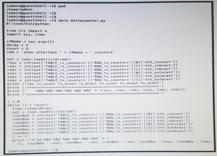 Refer to the exhibit: The script is called deltacounters.py and it is currently inside a Guest Shell container running inside a Cisco NX-OS switch.