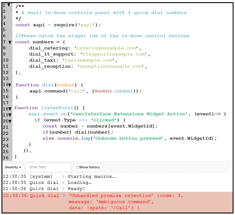 An end user reports that the speed dial button is not working on their Webex Device, and when loading into the Macro Editor, this error was presented. On which line is the incorrect syntax?