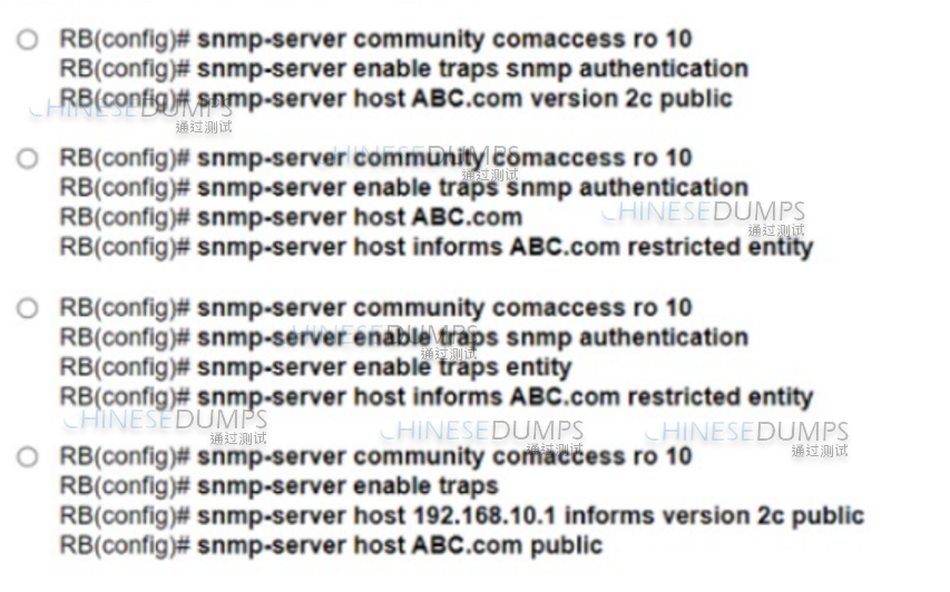 Option B is the correct answer because it meets all the given requirements. The configuration ''snmp-server community comaccess ro 10'' allows read-only access for all objects to members of Access-List 10 that use the comaccess community string. The ''snmp-server host ABC.com informs version 2c public'' command ensures SNMP authentication failure traps are sent to SNMPv2c and then to the host using SNMPv2c with the public community string.