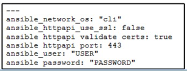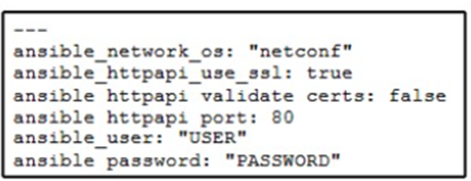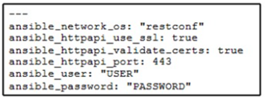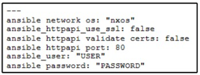 A network administrator copies SSL certificates to a Cisco NX-OS switch. An Ansible playbook is created to enable NX-API, which will use the new certificate. In the group_vars/vars.yml file, which code snippet must be used to define the properly formatted variables?