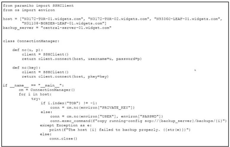 A developer must review an intern's code for a script they wrote to automate backups to the storage server. The script must connect to the network device and copy the running-config to the server. When considering maintainability, which two changes must be made to the code? (Choose two.)