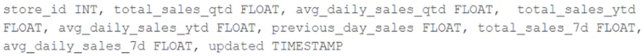 The business intelligence team has a dashboard configured to track various summary metrics for retail stories. This includes total sales for the previous day alongside totals and averages for a variety of time periods. The fields required to populate this dashboard have the following schema: