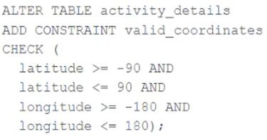 The CHECK constraint is used to ensure that the data inserted into the table meets the specified conditions. In this case, the CHECK constraint is used to ensure that the latitude and longitude values are within the specified range. If the data does not meet the specified conditions, the write operation will fail completely and no records will be inserted into the target table. This is because Delta Lake supports ACID transactions, which means that either all the data is written or none of it is written. Therefore, the batch insert will fail when it encounters a record that violates the constraint, and the target table will not be updated.Reference: