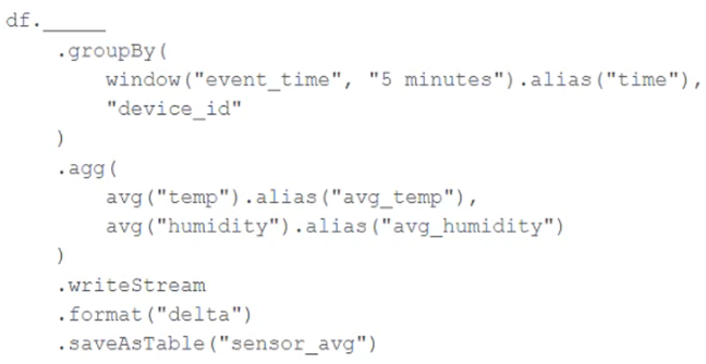 A junior data engineer has been asked to develop a streaming data pipeline with a grouped aggregation using DataFrame df. The pipeline needs to calculate the average humidity and average temperature for each non-overlapping five-minute interval. Incremental state information should be maintained for 10 minutes for late-arriving data.