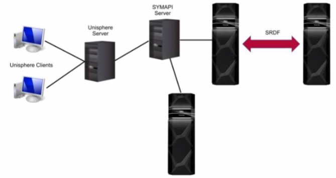 Separate SYMAPI Server: The diagram shows a dedicated SYMAPI server. SYMAPI (Symmetrix Application Programming Interface) is a command-line interface used to manage PowerMax and VMAX storage arrays. This indicates that the Unisphere server is not directly connected to the storage arrays.