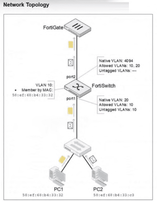 PC1 and PC2 are connected to port1 on FortiSwitch. Which VLAN tags will FortiSwitch apply when forwarding PC1 and PC2 traffic out of port2? (Choose one answer)