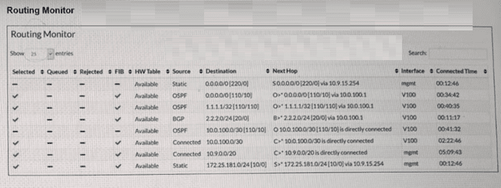 According to theFortiSwitchOS 7.6 Administration Guideand theFortiSwitch 7.6 Study Guide, the Routing Monitor provides a comprehensive view of the Routing Information Base (RIB), which includes all routes learned via static configuration or dynamic protocols (OSPF, BGP, etc.). However, not every route present in the RIB is active for traffic forwarding. The switch must select the 'best' path for any given destination to be installed into theForwarding Information Base (FIB).