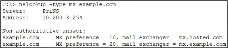 Refer to the exhibit which shows an nslookup output of MX records of the example.com domain.