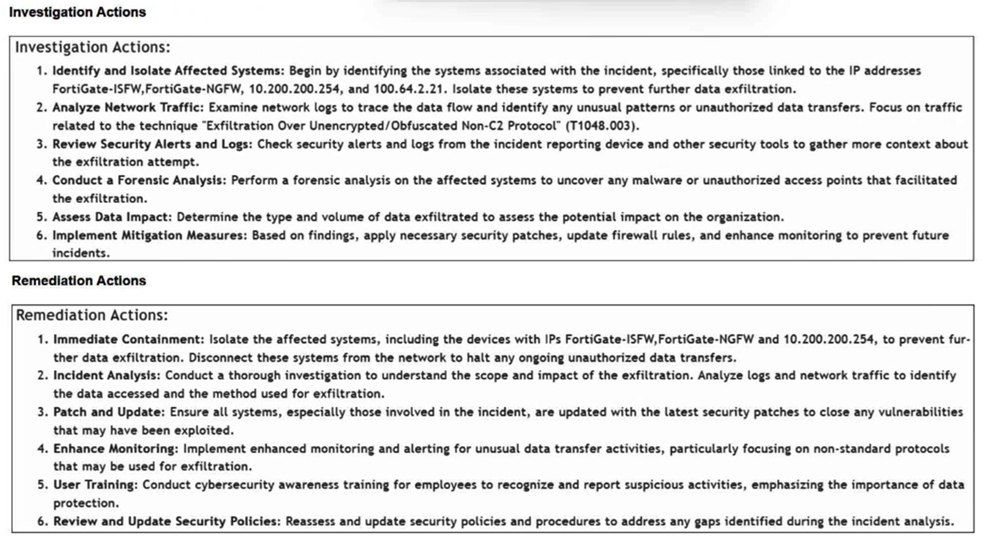 Structured Output: The output displayed in the exhibit---specifically the categorized Investigation Actions (identifying affected systems, analyzing traffic) and Remediation Actions (immediate containment, patching, user training)---is the typical result of a FortiAI summary request.