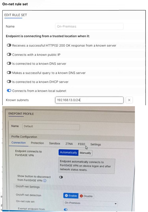 Action Logic (Exemption): In a FortiSASE Endpoint Profile, when On/off-net detection is enabled and an endpoint matches an 'On-net' rule, the standard behavior is to exempt the endpoint from auto-connecting to the FortiSASE VPN tunnel. This design assumes the endpoint is already in a secured office environment where the corporate firewall (FortiGate) provides the necessary protection, making the SASE tunnel redundant.