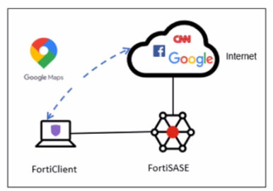 Traffic Redirection: Traffic matching these bypass rules is explicitly excluded from the FortiSASE VPN tunnel and instead sent directly out of the device's local internet gateway (physical interface). This is ideal for optimizing bandwidth and reducing latency for trusted, high-volume applications like mapping services or video conferencing.