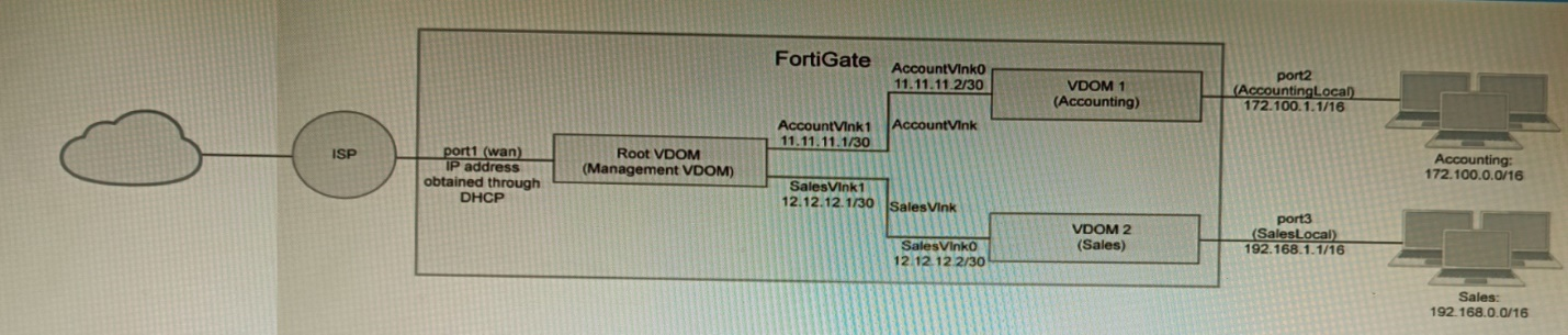 A customer has deployed a FortiGate 300E with virtual domains (VDOMs) enabled in the multi-VDOM mode. There are three VDOMs: Root is for management and internet access, while VDOM 1 and VDOM 2 are used for segregating internal traffic. AccountVInk and SalesVInk are standard VDOM links in Ethernet mode.