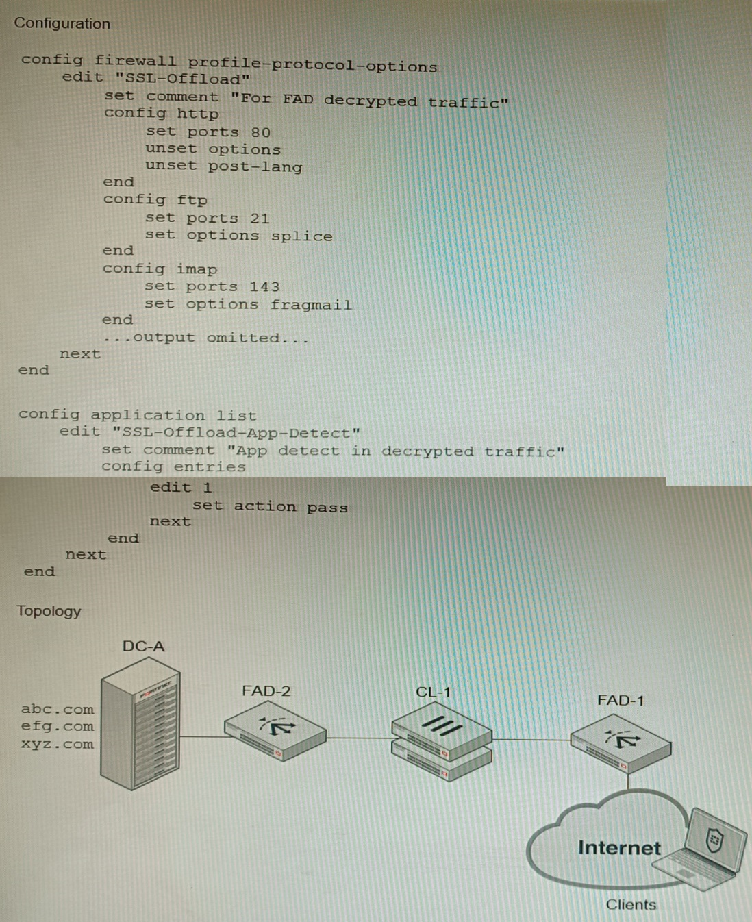 A FortiGate cluster (CL-1) protects a data center hosting multiple web applications. A pair of FortiADC devices are already configured for SSL decryption (FAD-1), and re-encryption (FAD-2). CL-1 must accept unencrypted traffic from FAD-1, perform application detection on the plain-text traffic, and forward the inspected traffic to FAD-2.