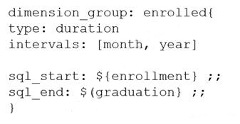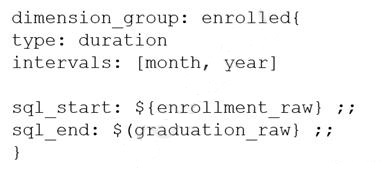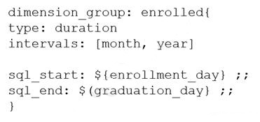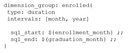 A developer has the dimensions enrollment_month and graduation_month already defined in the view. Both were created as part of dimension_groups of type: time. The developer need to use these two dimensions in the sql_start and sql_end parameters of a dimension group of type: duration.