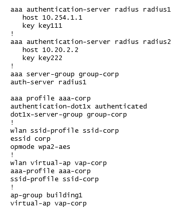 A joint venture between two companies results in a fully functional WLAN Aruba solution. The network administrator uses the following script to integrate the WLAN solution with two radius servers, radius1 and radius2.