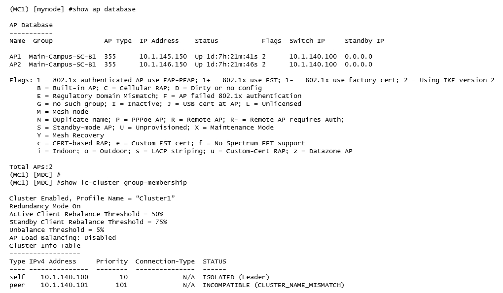 A network administrator adds a new Mobility Controller (MC) to the production Mobility Master (MM) and deploys APs that start broadcasting the employee SSID in the West wing of the building. Suddenly, the employees report client disconnects. When accessing the MM the network administrator notices that the MC is unreachable, then proceeds to access the MC's console and obtains the outputs shown in the exhibits.