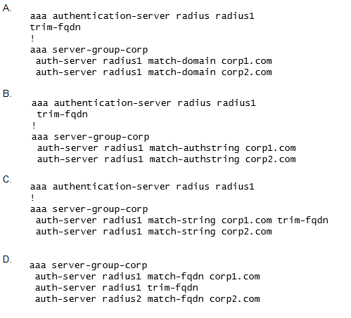 Which additional configuration is required to authenticate corp1.com users with radius1 and corp2 users with radius2?