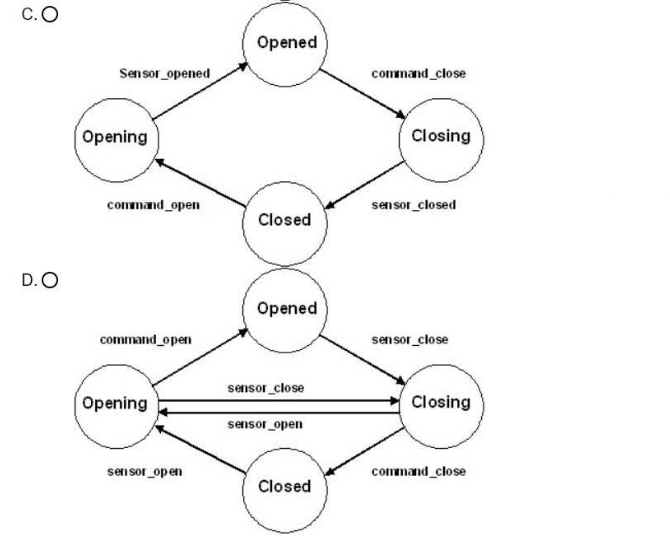 Exhibit B is the only state transition diagram that matches the text description of Acme's elevator door rules. It shows that the doors can transition between four states: Opened, Closing, Closed, and Opening. The transitions are triggered by either commands (open or close) or sensors (opened or closed). The diagram also shows that the open command can reverse the closing state, and the close command can reverse the opening state, as specified in the text. The other exhibits do not show the correct transitions or conditions for the elevator door system.Reference=