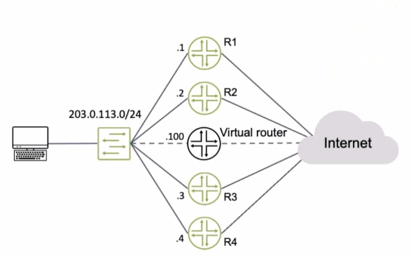 Routers R1 and R4 have a VRRP priority of 90, while R2 and R3 have default VRRP priorities