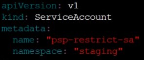 Create a new ServiceAccount named psp-restrict-sa in the existing namespace staging.