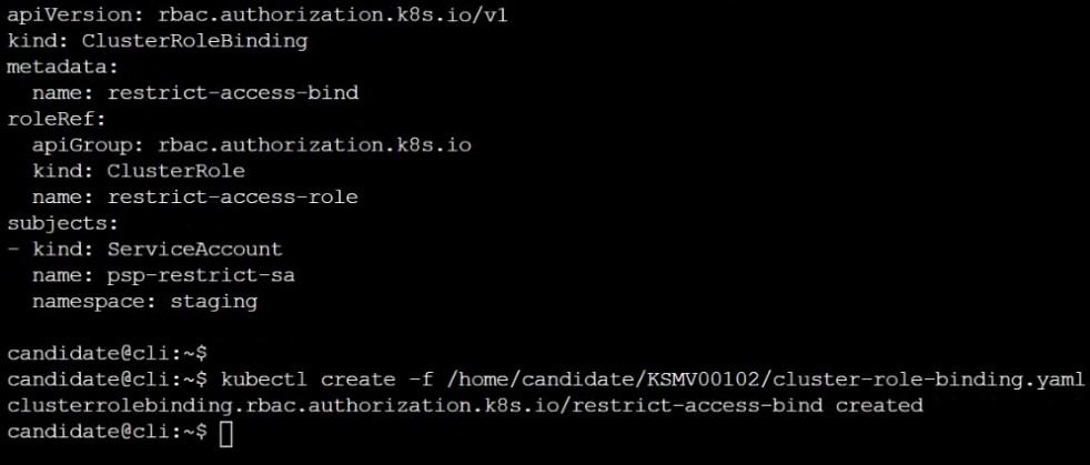 Finally, create a new ClusterRoleBinding named restrict-access-bind, which binds the newly created ClusterRole restrict-access-role to the newly created ServiceAccount psp-restrict-sa.