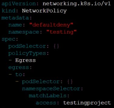 The new NetworkPolicy must deny all Egress traffic in the namespace testing.