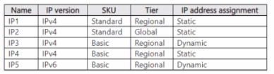 You have an Azure subscription that has the public IP addresses shown in the following table.