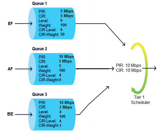 Given the scheduler-policy parameters shown, and assuming the offered rate of each queue is 10 Mbps, what are the operational PIR and CIR for queue 3?