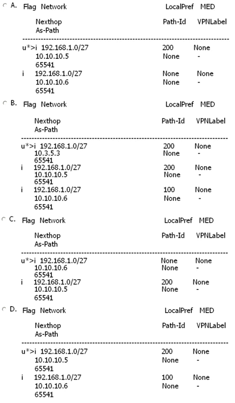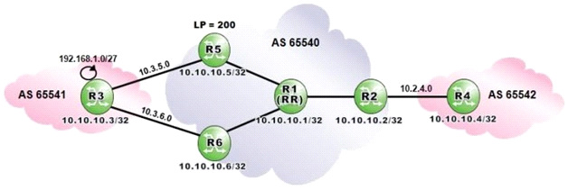 Router R1 is a route reflector with clients R2, R5 and R6. Prefixes advertised by router R5 have a local preference of 200. Router R3 advertises the prefix 192.168.1.0/27 to routers R5 and R6.