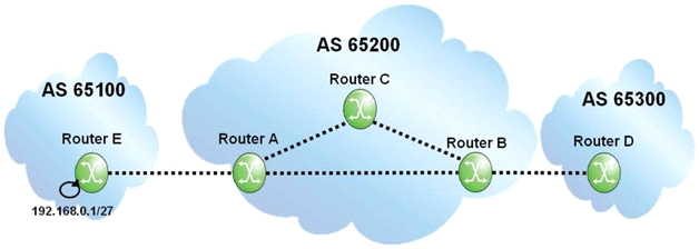 When router A receives the BGP update for the 192.168.0.1/27 prefix, it propagates it to routers B and C. What action is taken by router B when it receives the update?