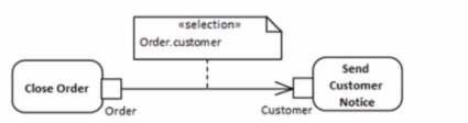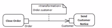 The correct answer is C, which uses a transformation edge to indicate that when an order is closed, information is transformed or processed to notify the customer. This is expressed in UML with an object flow that has a transformation property, which specifies how an object is transformed from one state to another as it flows along the edge. This is appropriate for a scenario where closing an order leads to the creation of a customer notice, implying some form of transformation or processing of the order information to generate the notice.