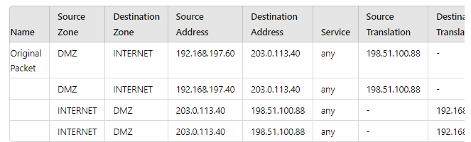 The table displays NAT rules configured on the firewall. The key points are: