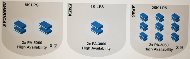 A network covers three geographical areas: Americas, Europe (EMEA), and Asia (APAC). The APAC segment of the network consists of nine HA pairs of PA-3060 firewalls, generating a combined log output of 25 K logs per second. Only 14 days of traffic log retention is required.