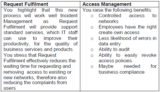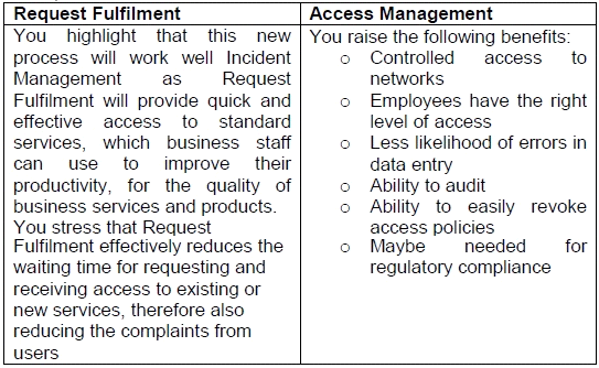 The Information Technology department acts as a Shared Service Unit, providing IT Services to all of sub-companies and departments, which complement some of the Internal Service Providers that also exist. The director of Information Technology has realized the need to improve the quality of services offered by implementing ITIL, and has decided to do so using a phased approach. Some of the Service Design and Service Transition processes have already been implemented, and they are now planning the implementation of Service Operation.