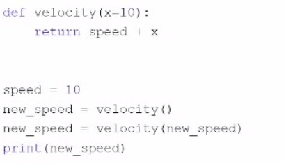 speed = 10 def velocity(): global speed speed = speed + 10 return speed